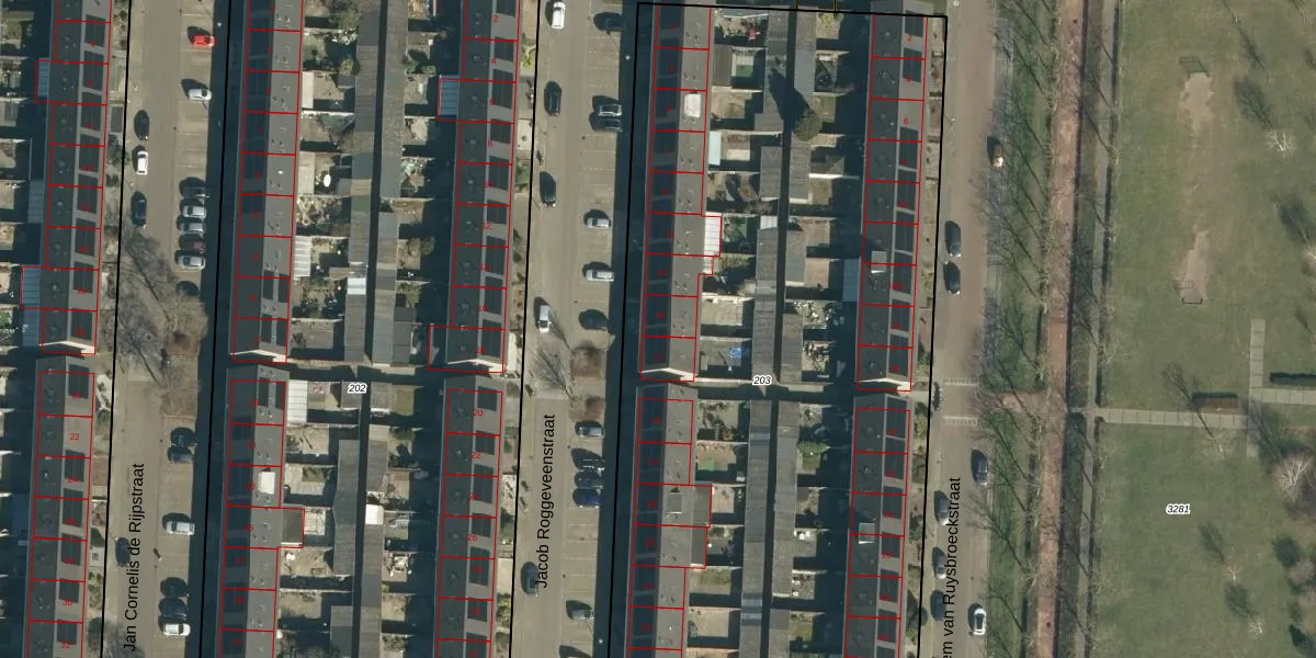 Jacob Roggeveenstraat 15 is gelegen op kadastraal perceel GDP00F203. Deze kadastrale aanduiding is uniek en wordt gebruikt door het Kadaster om eigendomsrechten en andere zakelijke rechten vast te leggen. Het perceel maakt onderdeel uit van de kadastrale gemeente Geldrop.