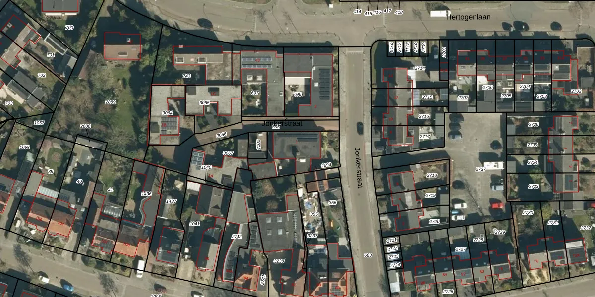 Het perceel waarop Jonkerstraat 1 staat heeft een oppervlakte van 377 m². Dit is een groot perceel. De perceeloppervlakte wordt geregistreerd door het Kadaster. Gedetailleerde informatie over de maten van dit perceel kunt u vinden in het rapport Kadastrale kaart met maatvoering van Jonkerstraat 1.