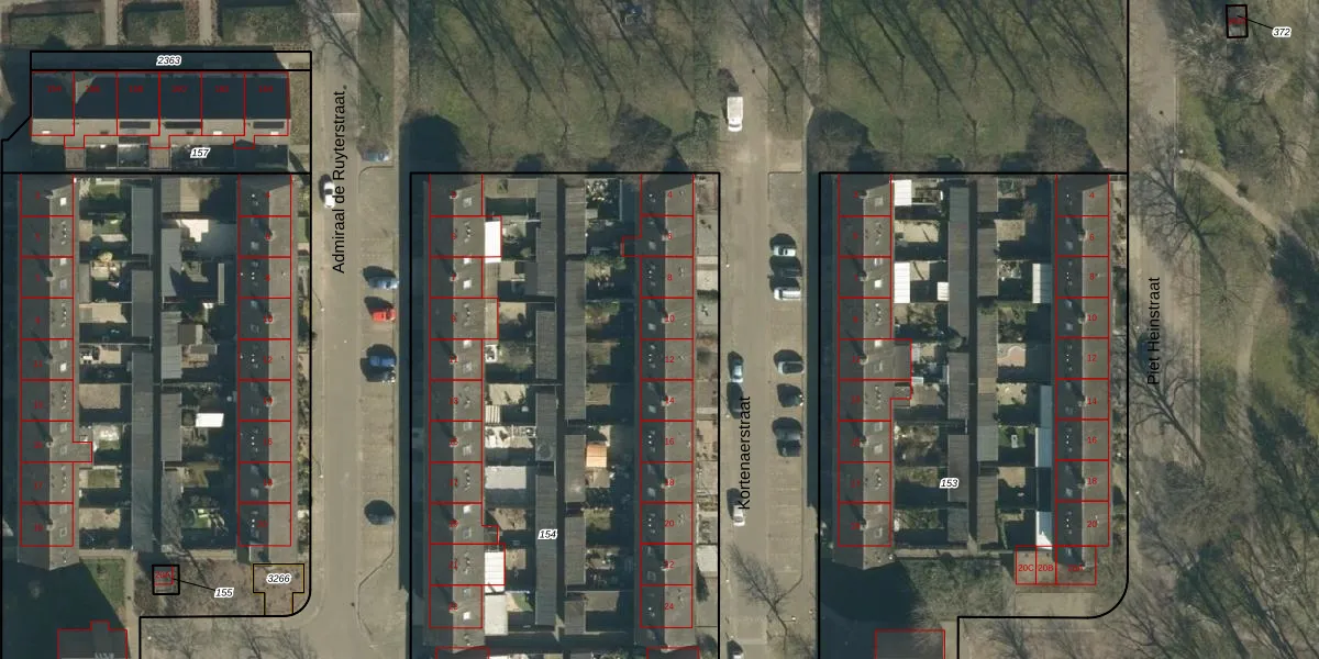 Het perceel waarop Kortenaerstraat 10 staat heeft een oppervlakte van 6144 m². Dit is een zeer groot perceel. De perceeloppervlakte wordt geregistreerd door het Kadaster. Gedetailleerde informatie over de maten van dit perceel kunt u vinden in het rapport Kadastrale kaart met maatvoering van Kortenaerstraat 10.