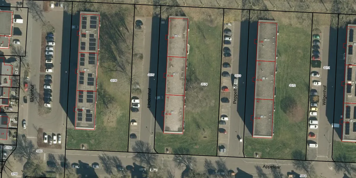 Het perceel waarop Lindenhof 33 staat heeft een oppervlakte van 2950 m². Dit is een zeer groot perceel. De perceeloppervlakte wordt geregistreerd door het Kadaster. Gedetailleerde informatie over de maten van dit perceel kunt u vinden in het rapport Kadastrale kaart met maatvoering van Lindenhof 33.