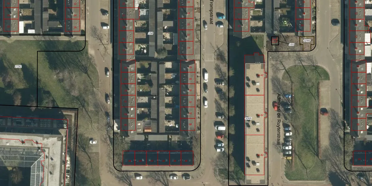 Het perceel waarop Maarten Trompstraat 30 staat heeft een oppervlakte van 6148 m². Dit is een zeer groot perceel. De perceeloppervlakte wordt geregistreerd door het Kadaster. Gedetailleerde informatie over de maten van dit perceel kunt u vinden in het rapport Kadastrale kaart met maatvoering van Maarten Trompstraat 30.