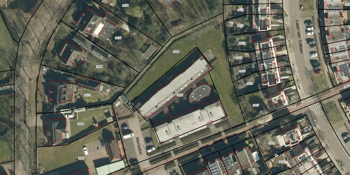 Het perceel waarop Meriadoc 18 staat heeft een oppervlakte van 1595 m². Dit is een zeer groot perceel. De perceeloppervlakte wordt geregistreerd door het Kadaster. Gedetailleerde informatie over de maten van dit perceel kunt u vinden in het rapport Kadastrale kaart met maatvoering van Meriadoc 18.