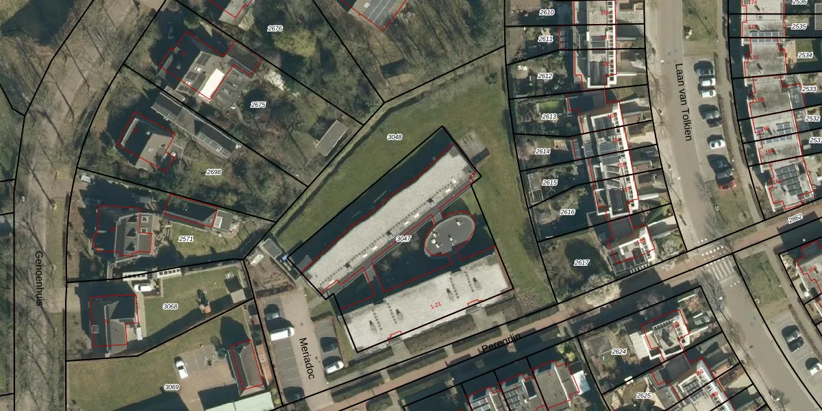 Het perceel waarop Meriadoc 19 staat heeft een oppervlakte van 1595 m². Dit is een zeer groot perceel. De perceeloppervlakte wordt geregistreerd door het Kadaster. Gedetailleerde informatie over de maten van dit perceel kunt u vinden in het rapport Kadastrale kaart met maatvoering van Meriadoc 19.