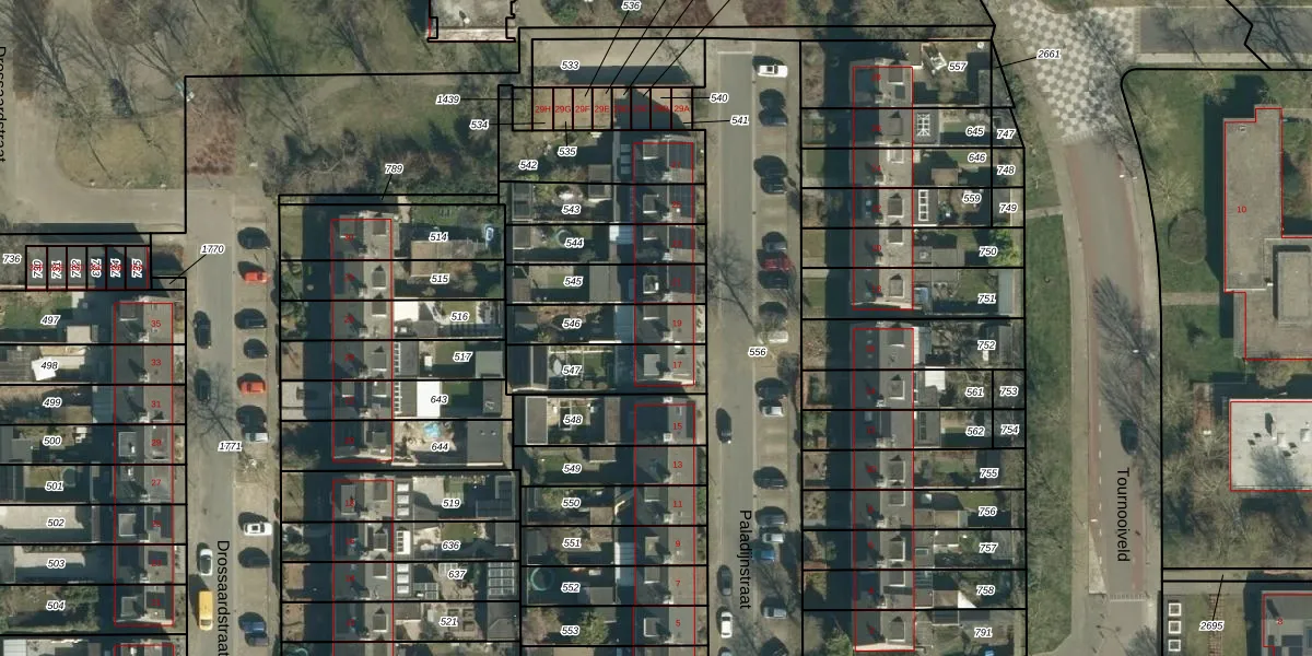 Paladijnstraat 19 is gelegen op kadastraal perceel GDP00E546. Deze kadastrale aanduiding is uniek en wordt gebruikt door het Kadaster om eigendomsrechten en andere zakelijke rechten vast te leggen. Het perceel maakt onderdeel uit van de kadastrale gemeente Geldrop.
