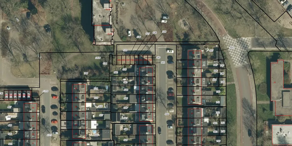 Paladijnstraat 27 is gelegen op kadastraal perceel GDP00E542. Deze kadastrale aanduiding is uniek en wordt gebruikt door het Kadaster om eigendomsrechten en andere zakelijke rechten vast te leggen. Het perceel maakt onderdeel uit van de kadastrale gemeente Geldrop.