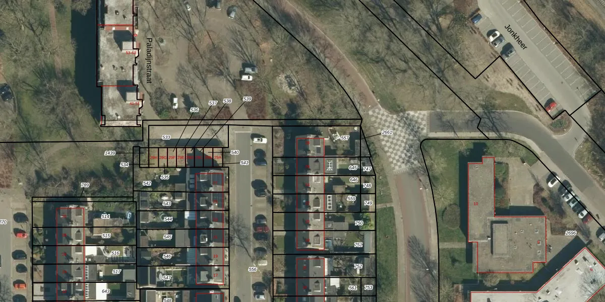 Paladijnstraat 28 is gelegen op kadastraal perceel GDP00E557. Deze kadastrale aanduiding is uniek en wordt gebruikt door het Kadaster om eigendomsrechten en andere zakelijke rechten vast te leggen. Het perceel maakt onderdeel uit van de kadastrale gemeente Geldrop.