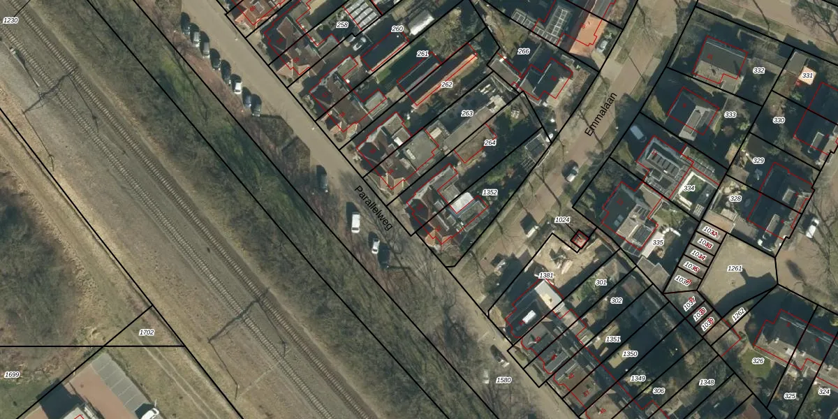 Het perceel waarop Parallelweg 53 staat heeft een oppervlakte van 382 m². Dit is een groot perceel. De perceeloppervlakte wordt geregistreerd door het Kadaster. Gedetailleerde informatie over de maten van dit perceel kunt u vinden in het rapport Kadastrale kaart met maatvoering van Parallelweg 53.