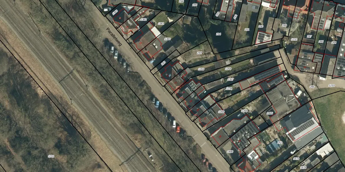 Parallelweg 71 is gelegen op kadastraal perceel GDP00K1359. Deze kadastrale aanduiding is uniek en wordt gebruikt door het Kadaster om eigendomsrechten en andere zakelijke rechten vast te leggen. Het perceel maakt onderdeel uit van de kadastrale gemeente Geldrop.