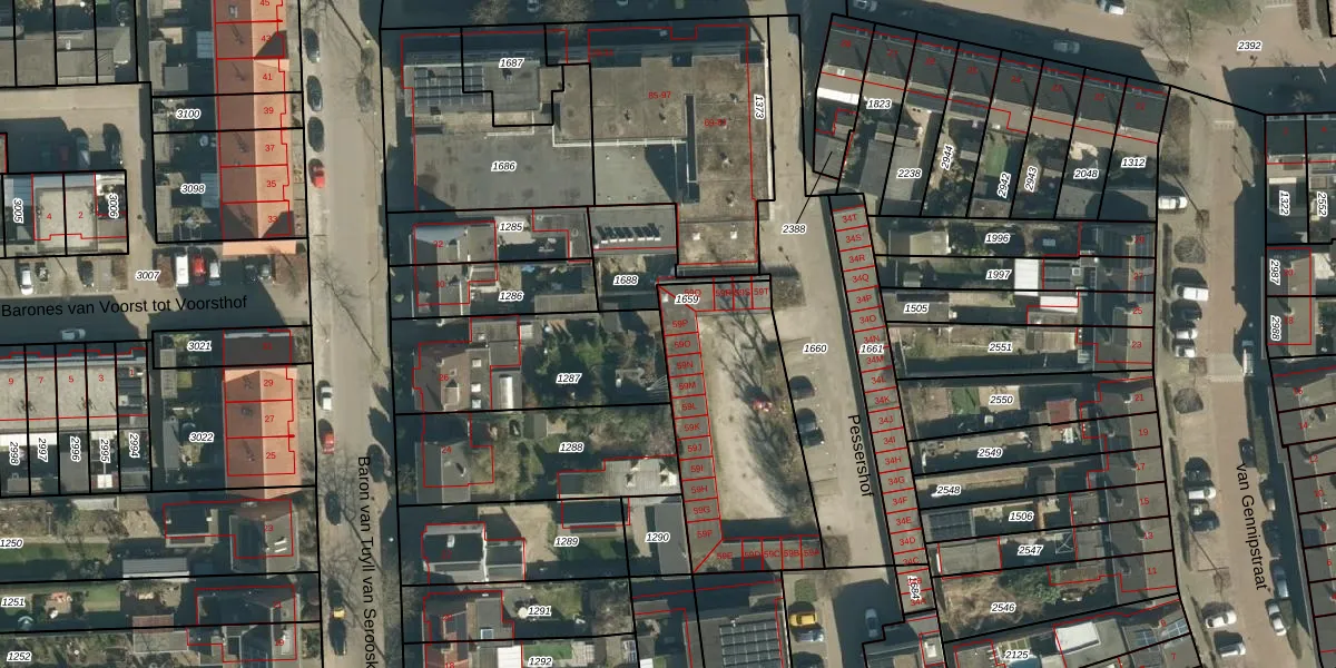 Pessershof 59-P is gelegen op kadastraal perceel GDP00F1659. Deze kadastrale aanduiding is uniek en wordt gebruikt door het Kadaster om eigendomsrechten en andere zakelijke rechten vast te leggen. Het perceel maakt onderdeel uit van de kadastrale gemeente Geldrop.