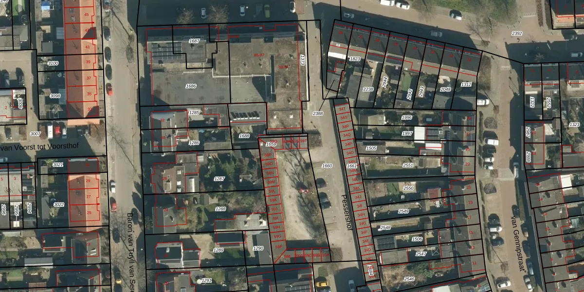 Pessershof 59-S is gelegen op kadastraal perceel GDP00F1659. Deze kadastrale aanduiding is uniek en wordt gebruikt door het Kadaster om eigendomsrechten en andere zakelijke rechten vast te leggen. Het perceel maakt onderdeel uit van de kadastrale gemeente Geldrop.