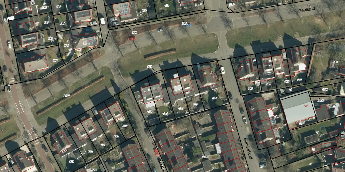 Het perceel waarop Peulland 28 staat heeft een oppervlakte van 253 m². Dit is een middelgroot perceel. De perceeloppervlakte wordt geregistreerd door het Kadaster. Gedetailleerde informatie over de maten van dit perceel kunt u vinden in het rapport Kadastrale kaart met maatvoering van Peulland 28.