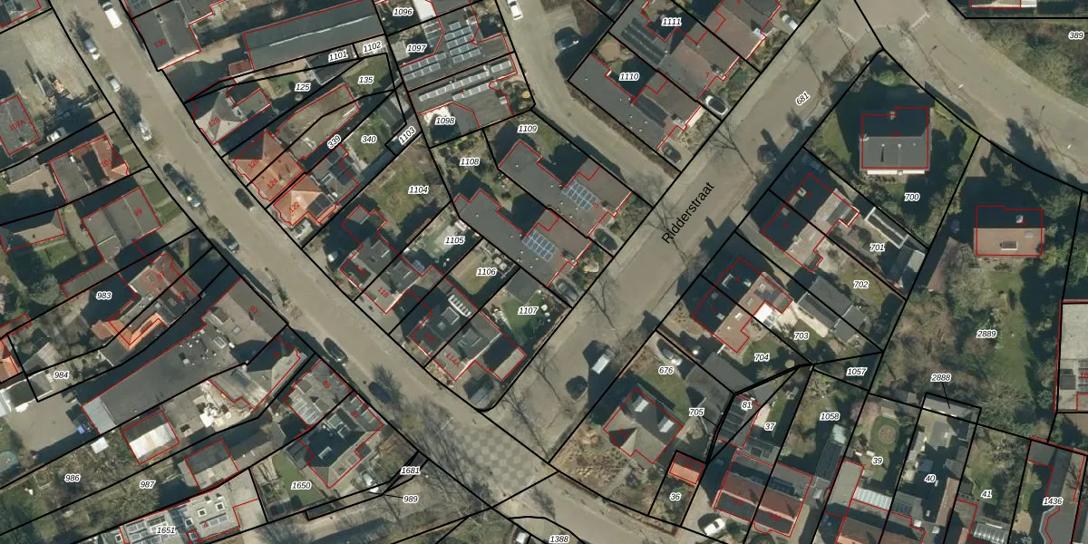 Ridderstraat 1 is gelegen op kadastraal perceel GDP00E1108. Deze kadastrale aanduiding is uniek en wordt gebruikt door het Kadaster om eigendomsrechten en andere zakelijke rechten vast te leggen. Het perceel maakt onderdeel uit van de kadastrale gemeente Geldrop.