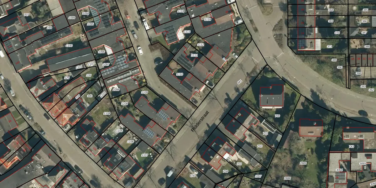 Ridderstraat 5 is gelegen op kadastraal perceel GDP00E1110. Deze kadastrale aanduiding is uniek en wordt gebruikt door het Kadaster om eigendomsrechten en andere zakelijke rechten vast te leggen. Het perceel maakt onderdeel uit van de kadastrale gemeente Geldrop.