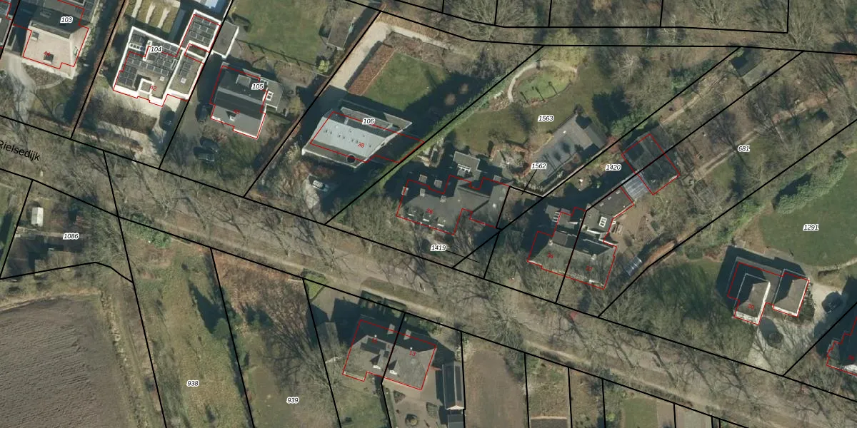 Rielsedijk 36 is gelegen op kadastraal perceel GDP00K1563. Deze kadastrale aanduiding is uniek en wordt gebruikt door het Kadaster om eigendomsrechten en andere zakelijke rechten vast te leggen. Het perceel maakt onderdeel uit van de kadastrale gemeente Geldrop.