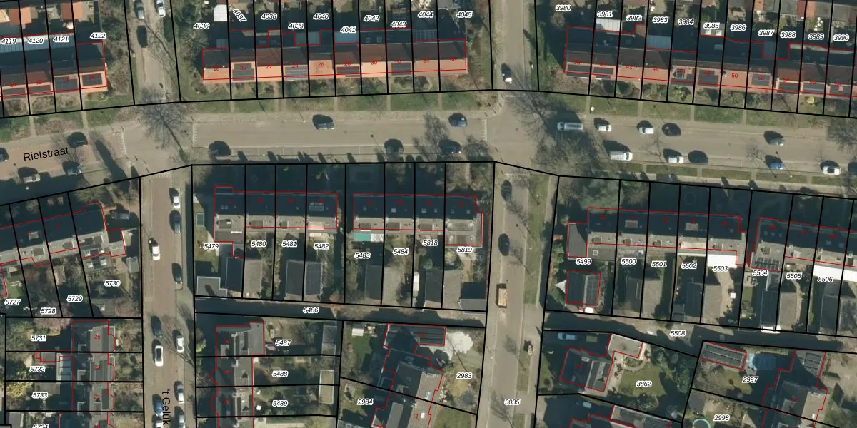 Rietstraat 21 is gelegen op kadastraal perceel GDP00D5818. Deze kadastrale aanduiding is uniek en wordt gebruikt door het Kadaster om eigendomsrechten en andere zakelijke rechten vast te leggen. Het perceel maakt onderdeel uit van de kadastrale gemeente Geldrop.