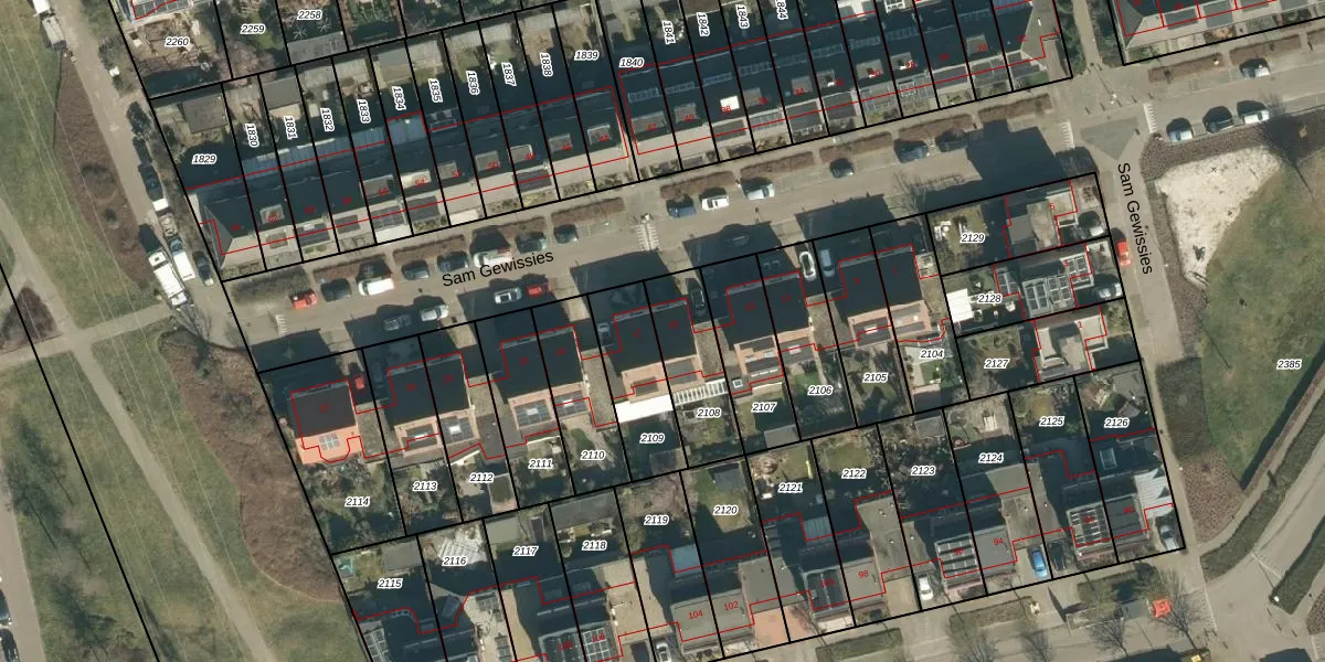 Sam Gewissies 15 is gelegen op kadastraal perceel GDP00E2108. Deze kadastrale aanduiding is uniek en wordt gebruikt door het Kadaster om eigendomsrechten en andere zakelijke rechten vast te leggen. Het perceel maakt onderdeel uit van de kadastrale gemeente Geldrop.