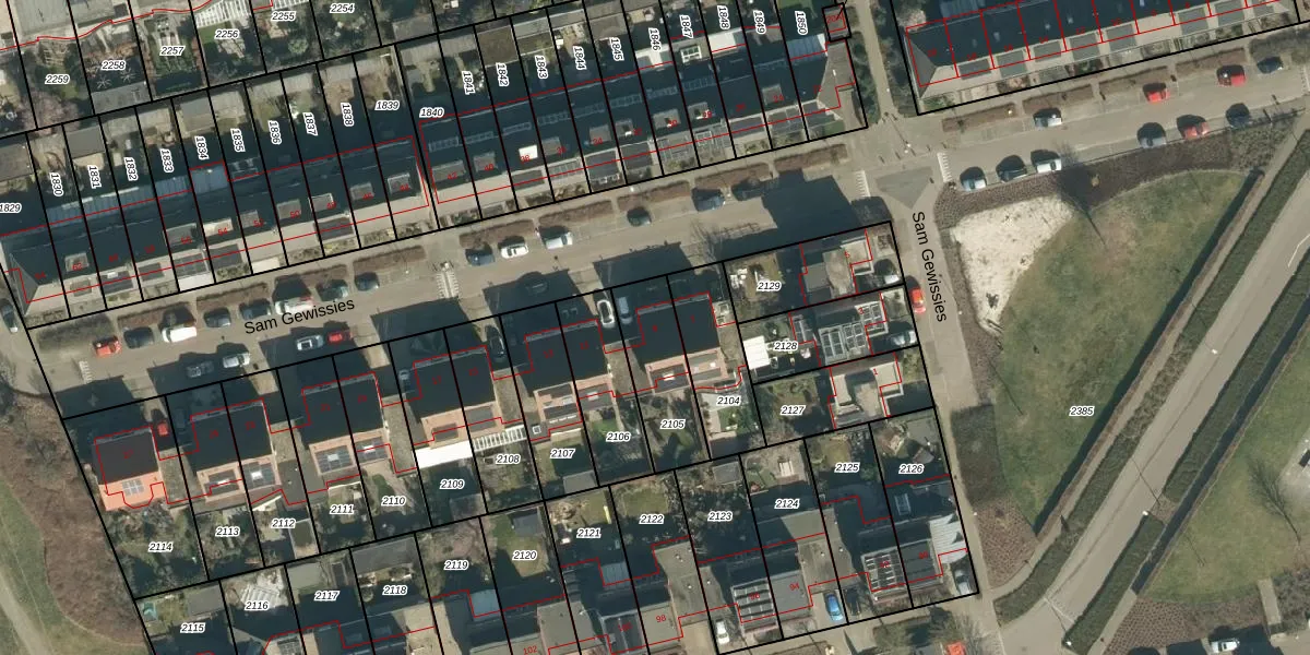 Sam Gewissies 9 is gelegen op kadastraal perceel GDP00E2105. Deze kadastrale aanduiding is uniek en wordt gebruikt door het Kadaster om eigendomsrechten en andere zakelijke rechten vast te leggen. Het perceel maakt onderdeel uit van de kadastrale gemeente Geldrop.