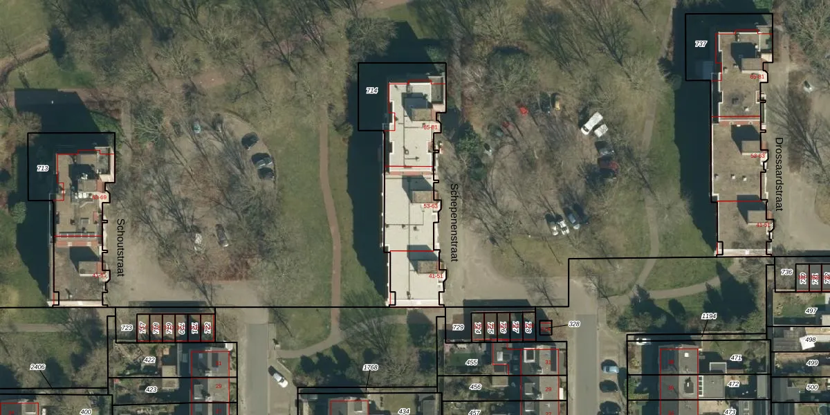 Het perceel waarop Schepenenstraat 55 staat heeft een oppervlakte van 849 m². Dit is een groot perceel. De perceeloppervlakte wordt geregistreerd door het Kadaster. Gedetailleerde informatie over de maten van dit perceel kunt u vinden in het rapport Kadastrale kaart met maatvoering van Schepenenstraat 55.