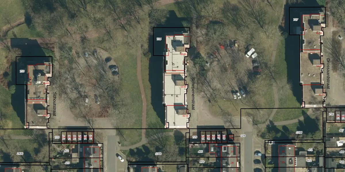 Schepenenstraat 59 is gelegen op kadastraal perceel GDP00E714. Deze kadastrale aanduiding is uniek en wordt gebruikt door het Kadaster om eigendomsrechten en andere zakelijke rechten vast te leggen. Het perceel maakt onderdeel uit van de kadastrale gemeente Geldrop.