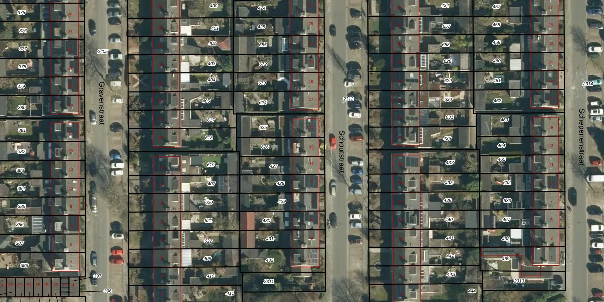 Het perceel waarop Schoutstraat 13 staat heeft een oppervlakte van 181 m². Dit is een middelgroot perceel. De perceeloppervlakte wordt geregistreerd door het Kadaster. Gedetailleerde informatie over de maten van dit perceel kunt u vinden in het rapport Kadastrale kaart met maatvoering van Schoutstraat 13.