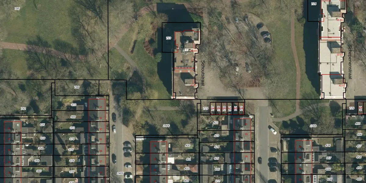 Schoutstraat 45 is gelegen op kadastraal perceel GDP00E713. Deze kadastrale aanduiding is uniek en wordt gebruikt door het Kadaster om eigendomsrechten en andere zakelijke rechten vast te leggen. Het perceel maakt onderdeel uit van de kadastrale gemeente Geldrop.