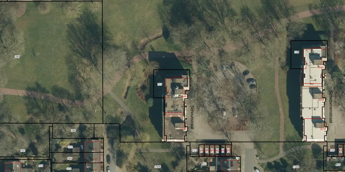 Het perceel waarop Schoutstraat 65 staat heeft een oppervlakte van 641 m². Dit is een groot perceel. De perceeloppervlakte wordt geregistreerd door het Kadaster. Gedetailleerde informatie over de maten van dit perceel kunt u vinden in het rapport Kadastrale kaart met maatvoering van Schoutstraat 65.