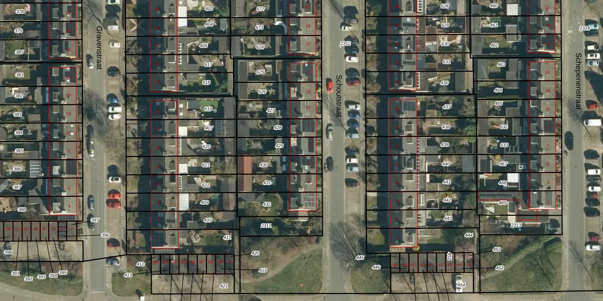 Schoutstraat 7 is gelegen op kadastraal perceel GDP00E429. Deze kadastrale aanduiding is uniek en wordt gebruikt door het Kadaster om eigendomsrechten en andere zakelijke rechten vast te leggen. Het perceel maakt onderdeel uit van de kadastrale gemeente Geldrop.