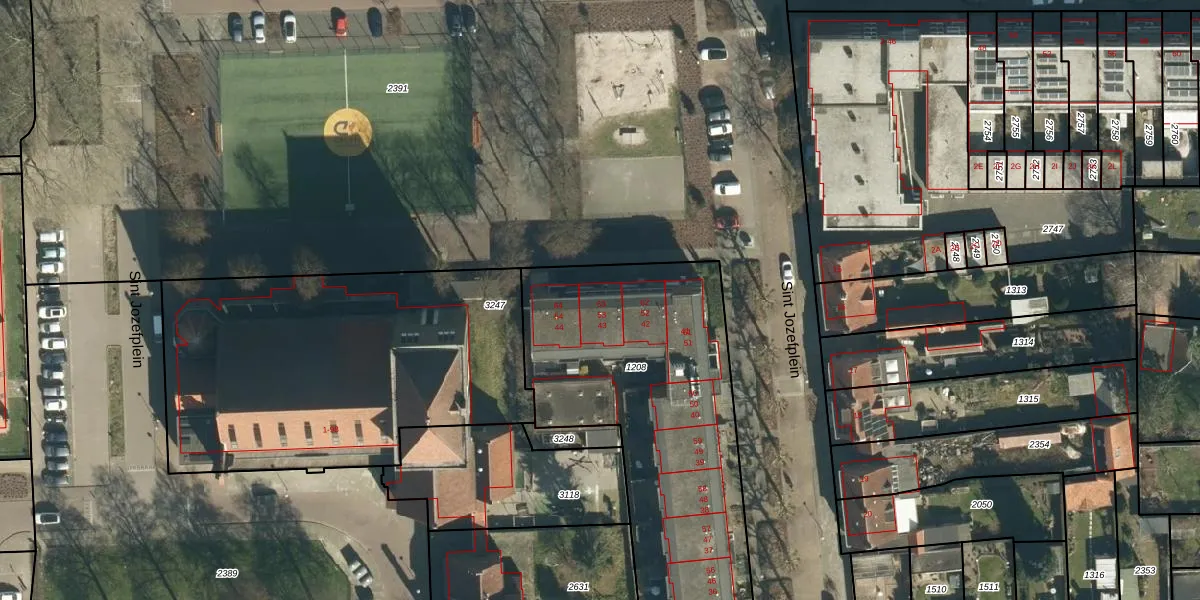 Sint Jozefplein 43 is gelegen op kadastraal perceel GDP00F1208. Deze kadastrale aanduiding is uniek en wordt gebruikt door het Kadaster om eigendomsrechten en andere zakelijke rechten vast te leggen. Het perceel maakt onderdeel uit van de kadastrale gemeente Geldrop.