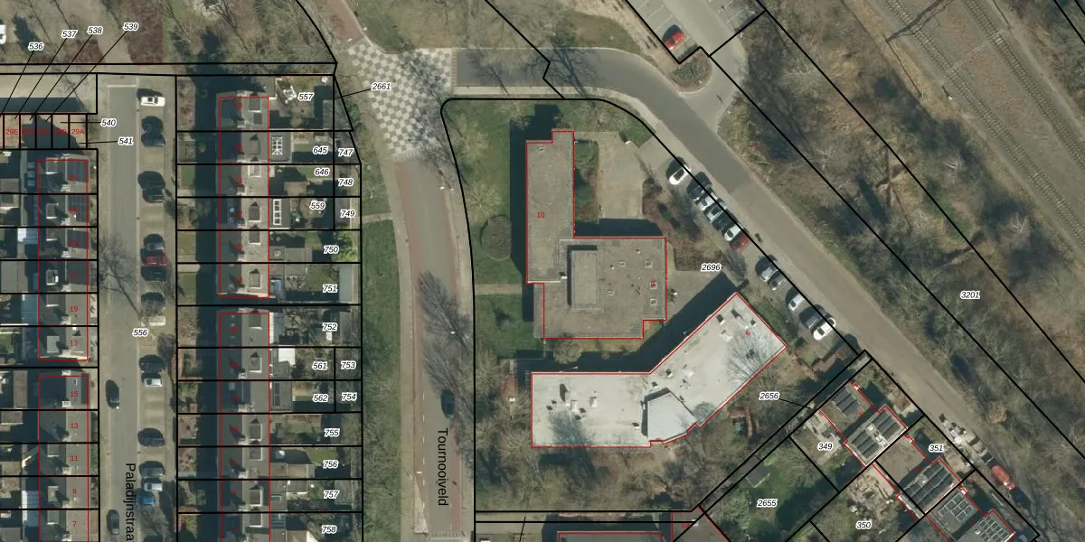 Tournooiveld 10 is gelegen op kadastraal perceel GDP00E2696. Deze kadastrale aanduiding is uniek en wordt gebruikt door het Kadaster om eigendomsrechten en andere zakelijke rechten vast te leggen. Het perceel maakt onderdeel uit van de kadastrale gemeente Geldrop.