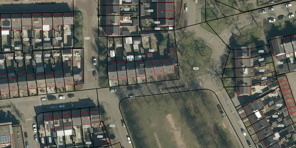 Volmolenplein 14 is gelegen op kadastraal perceel GDP00C6671. Deze kadastrale aanduiding is uniek en wordt gebruikt door het Kadaster om eigendomsrechten en andere zakelijke rechten vast te leggen. Het perceel maakt onderdeel uit van de kadastrale gemeente Geldrop.