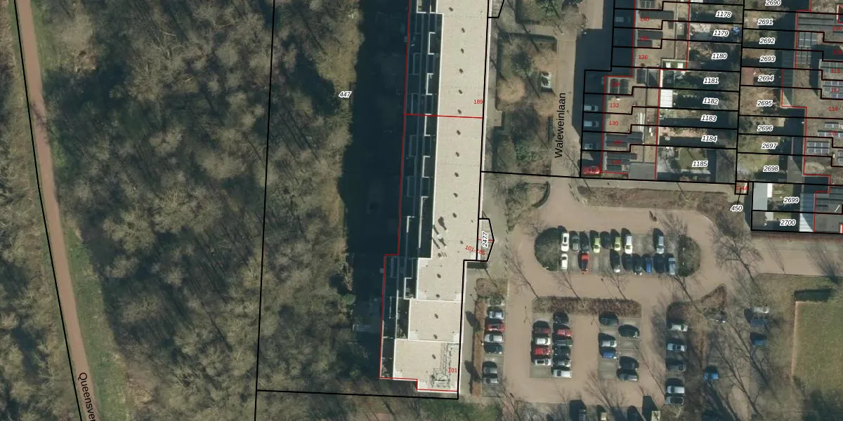 Waleweinlaan 165 is gelegen op kadastraal perceel GDP00F447. Deze kadastrale aanduiding is uniek en wordt gebruikt door het Kadaster om eigendomsrechten en andere zakelijke rechten vast te leggen. Het perceel maakt onderdeel uit van de kadastrale gemeente Geldrop.