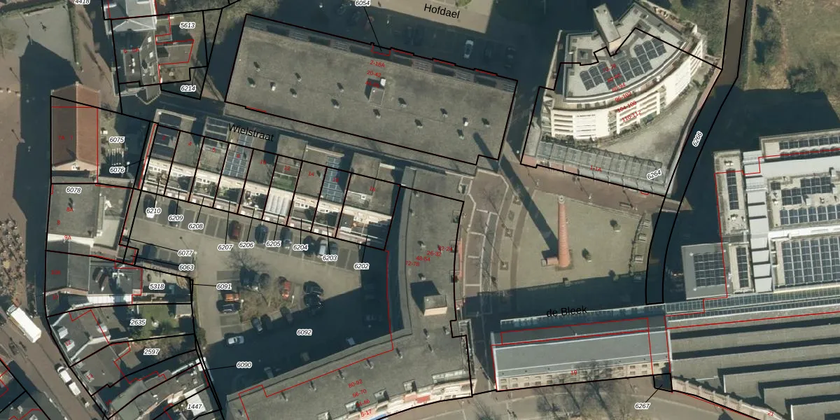 Het perceel waarop Wielstraat 54 staat heeft een oppervlakte van 3412 m². Dit is een zeer groot perceel. De perceeloppervlakte wordt geregistreerd door het Kadaster. Gedetailleerde informatie over de maten van dit perceel kunt u vinden in het rapport Kadastrale kaart met maatvoering van Wielstraat 54.