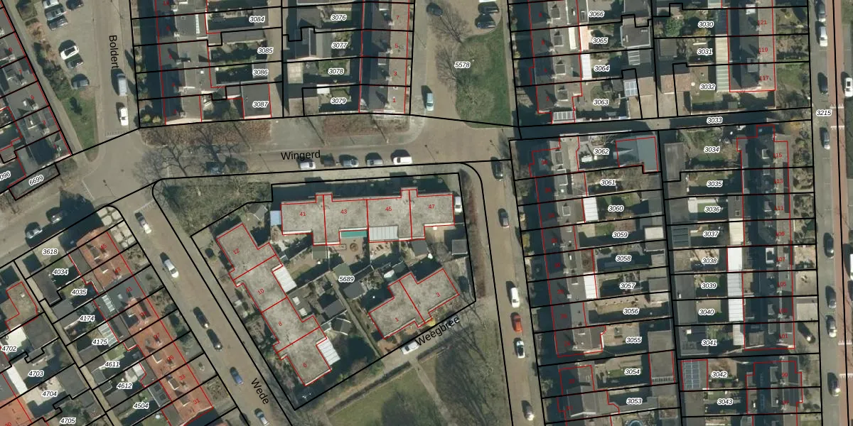 Het perceel waarop Wingerd 47 staat heeft een oppervlakte van 2389 m². Dit is een zeer groot perceel. De perceeloppervlakte wordt geregistreerd door het Kadaster. Gedetailleerde informatie over de maten van dit perceel kunt u vinden in het rapport Kadastrale kaart met maatvoering van Wingerd 47.