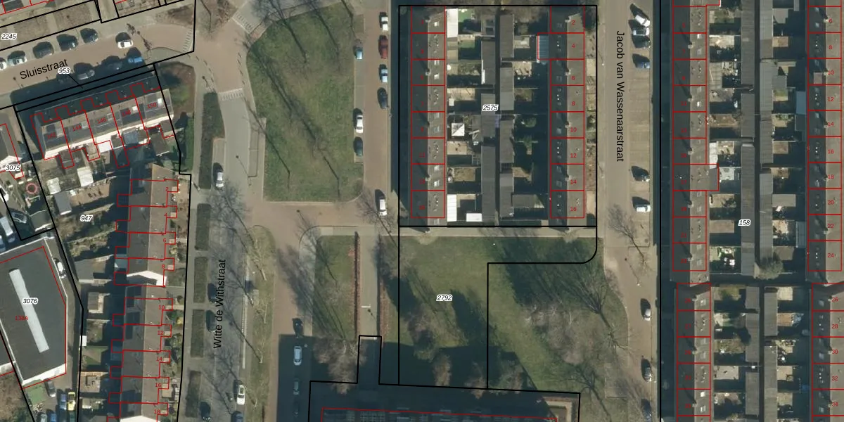 Het perceel waarop Witte de Withstraat 15 staat heeft een oppervlakte van 2449 m². Dit is een zeer groot perceel. De perceeloppervlakte wordt geregistreerd door het Kadaster. Gedetailleerde informatie over de maten van dit perceel kunt u vinden in het rapport Kadastrale kaart met maatvoering van Witte de Withstraat 15.