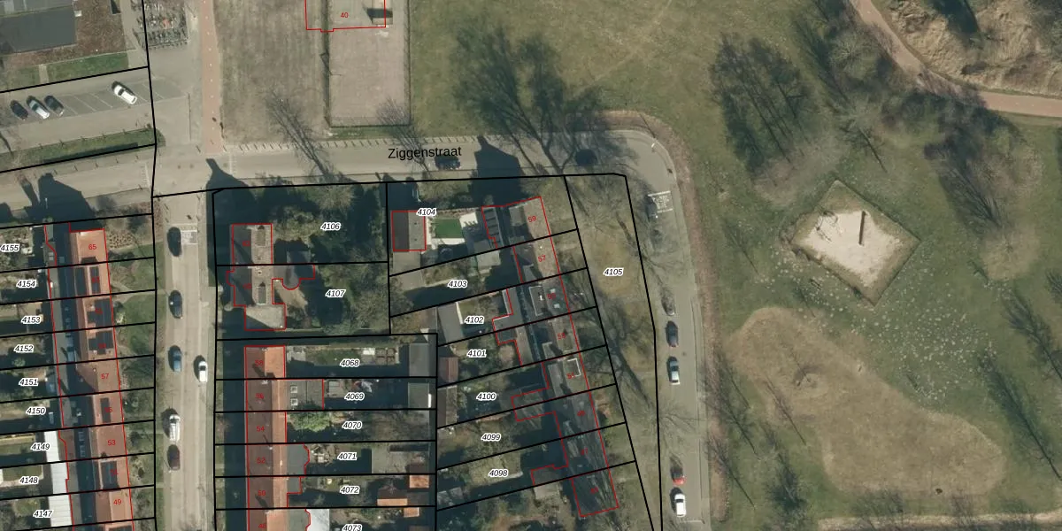 Ziggenstraat 57 is gelegen op kadastraal perceel GDP00D4103. Deze kadastrale aanduiding is uniek en wordt gebruikt door het Kadaster om eigendomsrechten en andere zakelijke rechten vast te leggen. Het perceel maakt onderdeel uit van de kadastrale gemeente Geldrop.