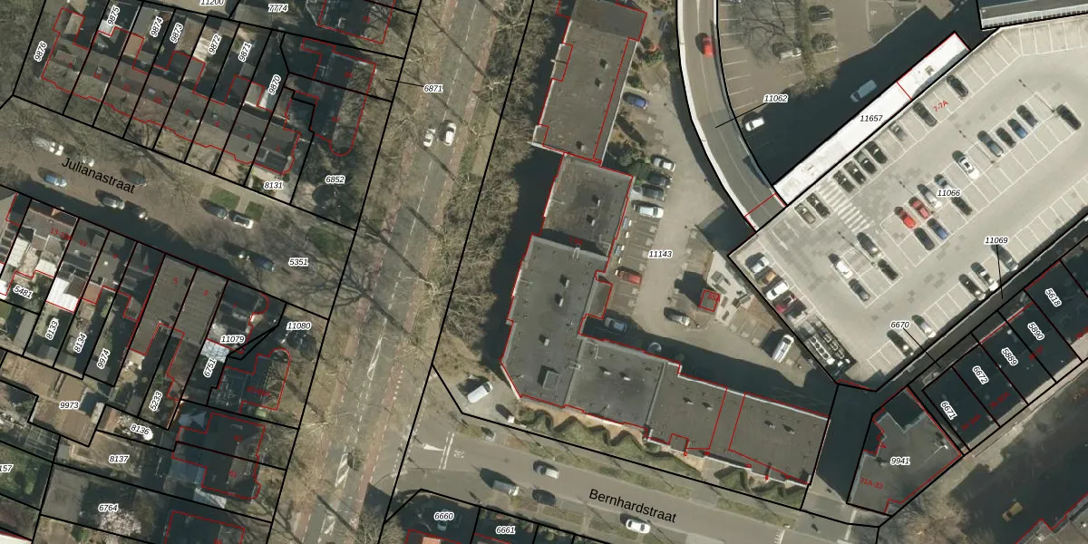 Het perceel waarop Bernhardstraat 33 staat heeft een oppervlakte van 5029 m². Dit is een zeer groot perceel. De perceeloppervlakte wordt geregistreerd door het Kadaster. Gedetailleerde informatie over de maten van dit perceel kunt u vinden in het rapport Kadastrale kaart met maatvoering van Bernhardstraat 33.