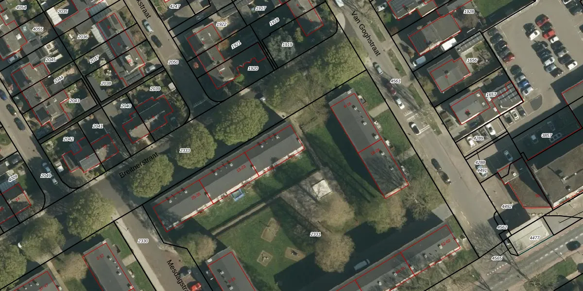 Het perceel waarop Breitnerstraat 5 staat heeft een oppervlakte van 6465 m². Dit is een zeer groot perceel. De perceeloppervlakte wordt geregistreerd door het Kadaster. Gedetailleerde informatie over de maten van dit perceel kunt u vinden in het rapport Kadastrale kaart met maatvoering van Breitnerstraat 5.