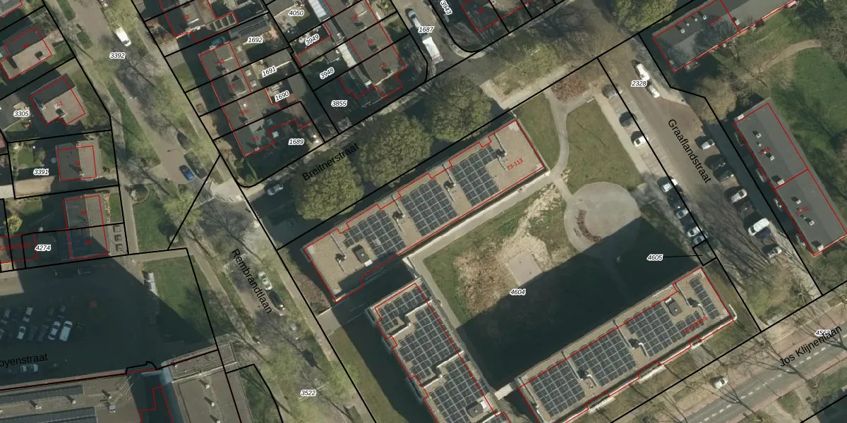 Het perceel waarop Breitnerstraat 77 staat heeft een oppervlakte van 6709 m². Dit is een zeer groot perceel. De perceeloppervlakte wordt geregistreerd door het Kadaster. Gedetailleerde informatie over de maten van dit perceel kunt u vinden in het rapport Kadastrale kaart met maatvoering van Breitnerstraat 77.