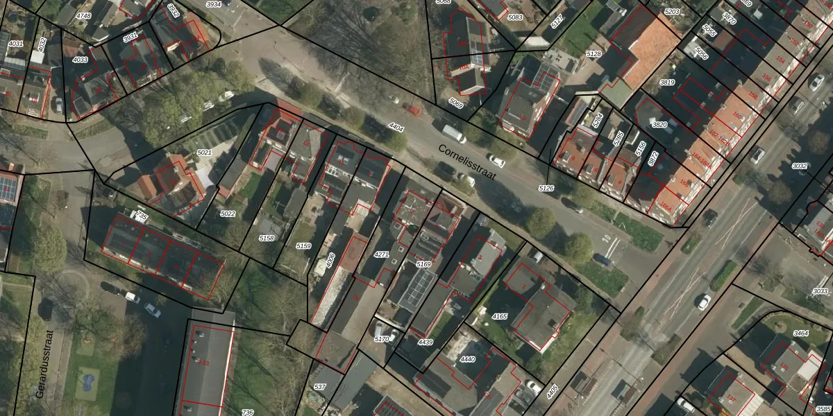 Het perceel waarop Cornelisstraat 7 staat heeft een oppervlakte van 527 m². Dit is een groot perceel. De perceeloppervlakte wordt geregistreerd door het Kadaster. Gedetailleerde informatie over de maten van dit perceel kunt u vinden in het rapport Kadastrale kaart met maatvoering van Cornelisstraat 7.