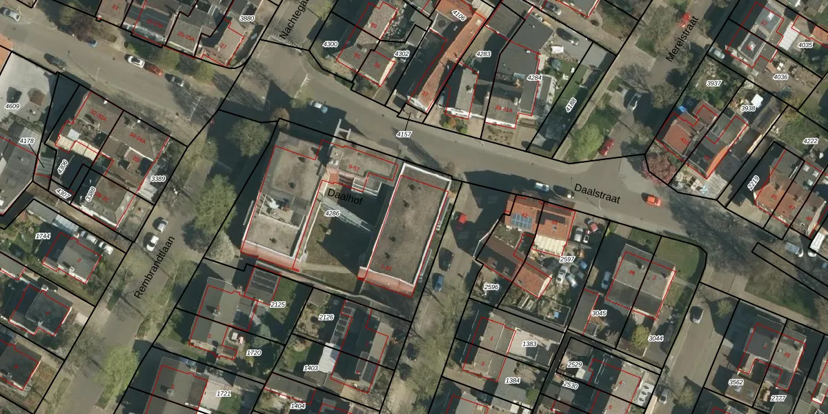 Het perceel waarop Daalhof 25 staat heeft een oppervlakte van 1772 m². Dit is een zeer groot perceel. De perceeloppervlakte wordt geregistreerd door het Kadaster. Gedetailleerde informatie over de maten van dit perceel kunt u vinden in het rapport Kadastrale kaart met maatvoering van Daalhof 25.