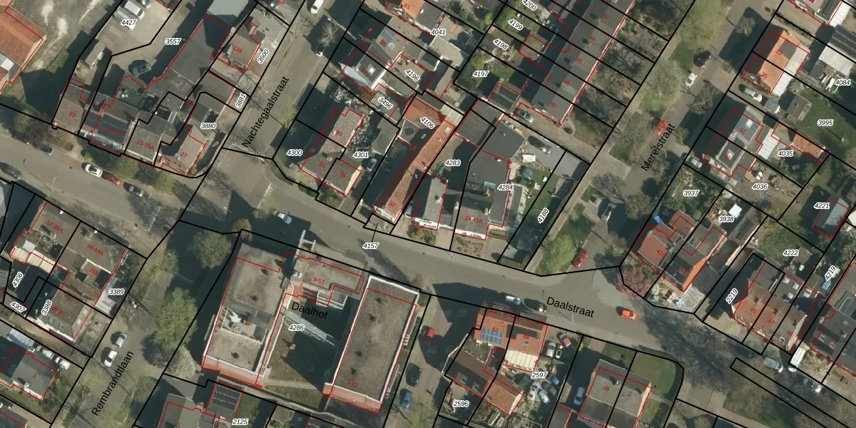 Het perceel waarop Daalstraat 39 staat heeft een oppervlakte van 319 m². Dit is een groot perceel. De perceeloppervlakte wordt geregistreerd door het Kadaster. Gedetailleerde informatie over de maten van dit perceel kunt u vinden in het rapport Kadastrale kaart met maatvoering van Daalstraat 39.