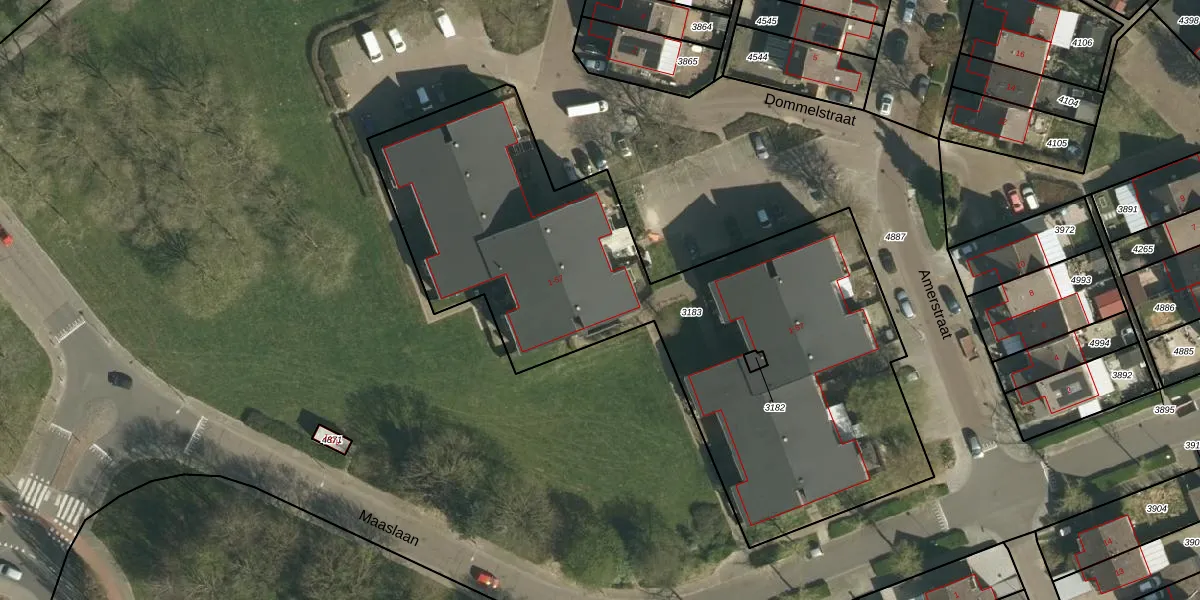 Het perceel waarop Dommelstraat 1 staat heeft een oppervlakte van 2950 m². Dit is een zeer groot perceel. De perceeloppervlakte wordt geregistreerd door het Kadaster. Gedetailleerde informatie over de maten van dit perceel kunt u vinden in het rapport Kadastrale kaart met maatvoering van Dommelstraat 1.