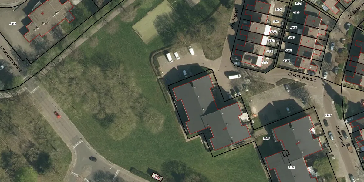 Het perceel waarop Dommelstraat 13 staat heeft een oppervlakte van 2950 m². Dit is een zeer groot perceel. De perceeloppervlakte wordt geregistreerd door het Kadaster. Gedetailleerde informatie over de maten van dit perceel kunt u vinden in het rapport Kadastrale kaart met maatvoering van Dommelstraat 13.