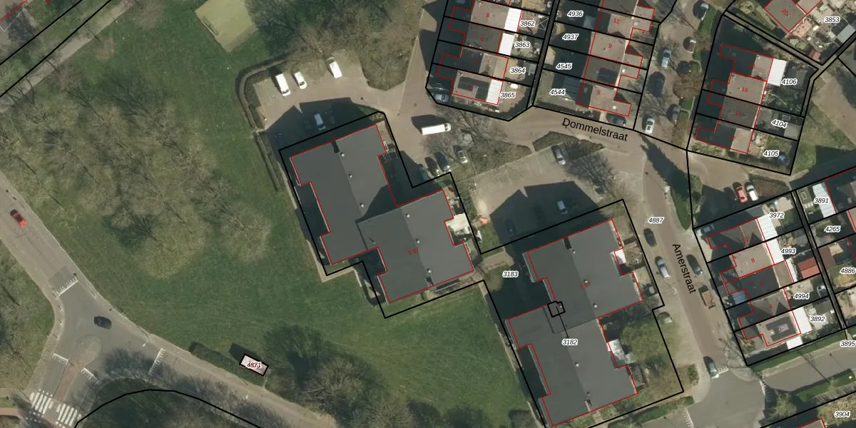 Het perceel waarop Dommelstraat 29 staat heeft een oppervlakte van 2950 m². Dit is een zeer groot perceel. De perceeloppervlakte wordt geregistreerd door het Kadaster. Gedetailleerde informatie over de maten van dit perceel kunt u vinden in het rapport Kadastrale kaart met maatvoering van Dommelstraat 29.
