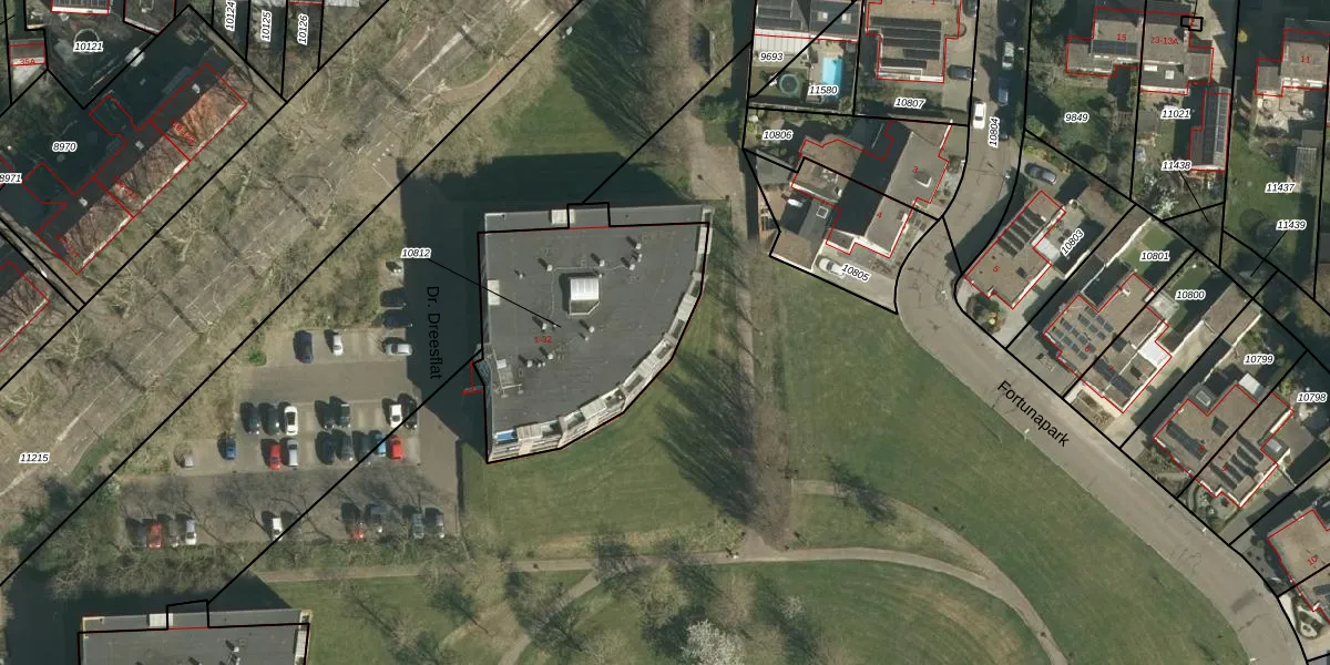 Het perceel waarop Dr. Dreesflat 12 staat heeft een oppervlakte van 962 m². Dit is een groot perceel. De perceeloppervlakte wordt geregistreerd door het Kadaster. Gedetailleerde informatie over de maten van dit perceel kunt u vinden in het rapport Kadastrale kaart met maatvoering van Dr. Dreesflat 12.