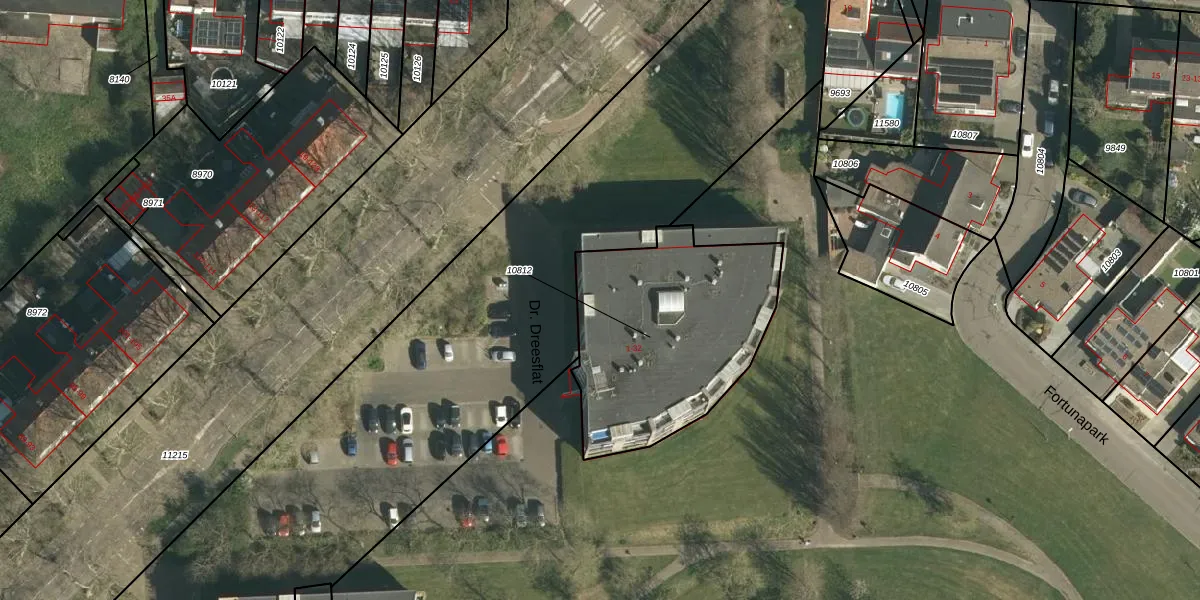 Het perceel waarop Dr. Dreesflat 32 staat heeft een oppervlakte van 962 m². Dit is een groot perceel. De perceeloppervlakte wordt geregistreerd door het Kadaster. Gedetailleerde informatie over de maten van dit perceel kunt u vinden in het rapport Kadastrale kaart met maatvoering van Dr. Dreesflat 32.