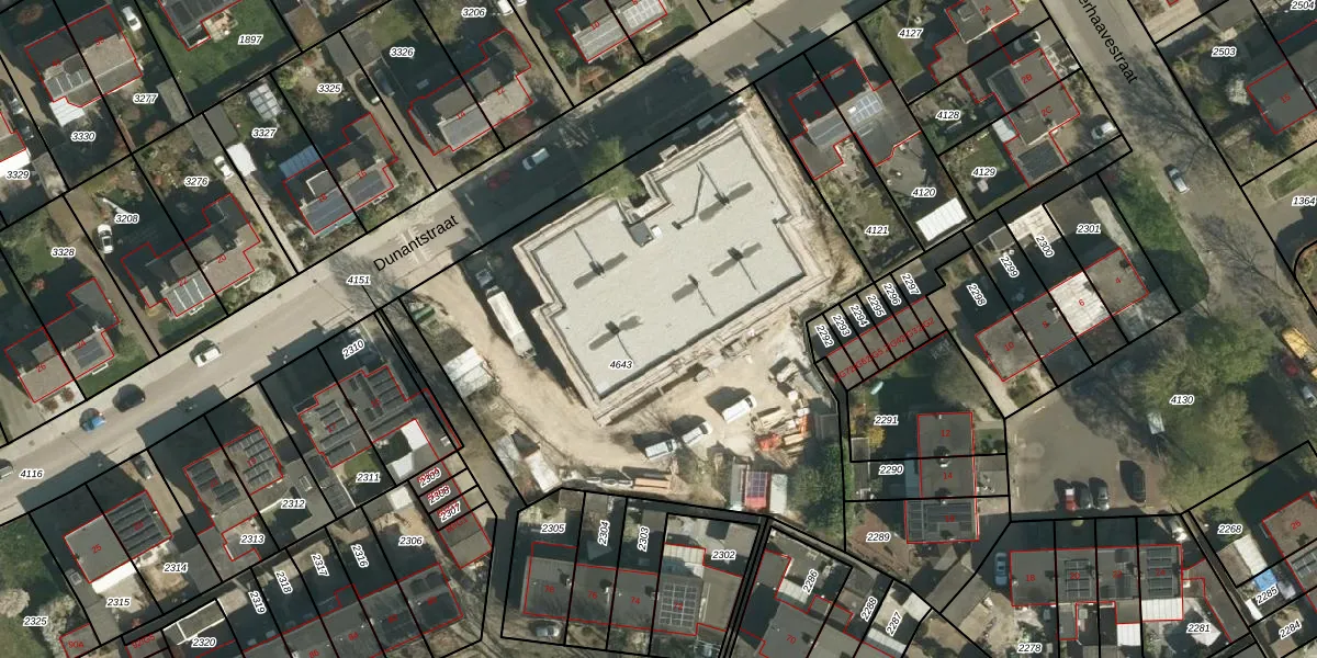 Het perceel waarop Dunantstraat 11-B-6 staat heeft een oppervlakte van 3000 m². Dit is een zeer groot perceel. De perceeloppervlakte wordt geregistreerd door het Kadaster. Gedetailleerde informatie over de maten van dit perceel kunt u vinden in het rapport Kadastrale kaart met maatvoering van Dunantstraat 11-B-6.