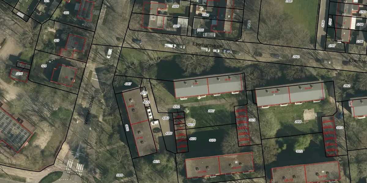 Het perceel waarop Eberhardstraat 10 staat heeft een oppervlakte van 1140 m². Dit is een zeer groot perceel. De perceeloppervlakte wordt geregistreerd door het Kadaster. Gedetailleerde informatie over de maten van dit perceel kunt u vinden in het rapport Kadastrale kaart met maatvoering van Eberhardstraat 10.