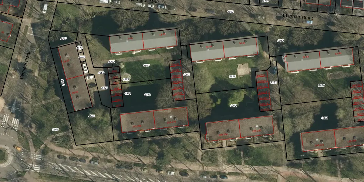 Het perceel waarop Eberhardstraat 32-G23 staat heeft een oppervlakte van 300 m². Dit is een groot perceel. De perceeloppervlakte wordt geregistreerd door het Kadaster. Gedetailleerde informatie over de maten van dit perceel kunt u vinden in het rapport Kadastrale kaart met maatvoering van Eberhardstraat 32-G23.