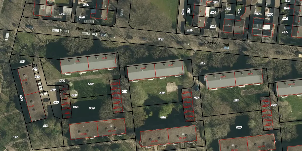Het perceel waarop Eberhardstraat 48 staat heeft een oppervlakte van 1105 m². Dit is een zeer groot perceel. De perceeloppervlakte wordt geregistreerd door het Kadaster. Gedetailleerde informatie over de maten van dit perceel kunt u vinden in het rapport Kadastrale kaart met maatvoering van Eberhardstraat 48.